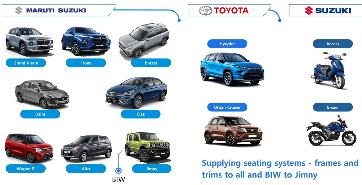 - Maruti Suzuki – Grand Vitara, Brezza, Fronx, Dzire, Wagon R, Alto, Jimny (BIW)