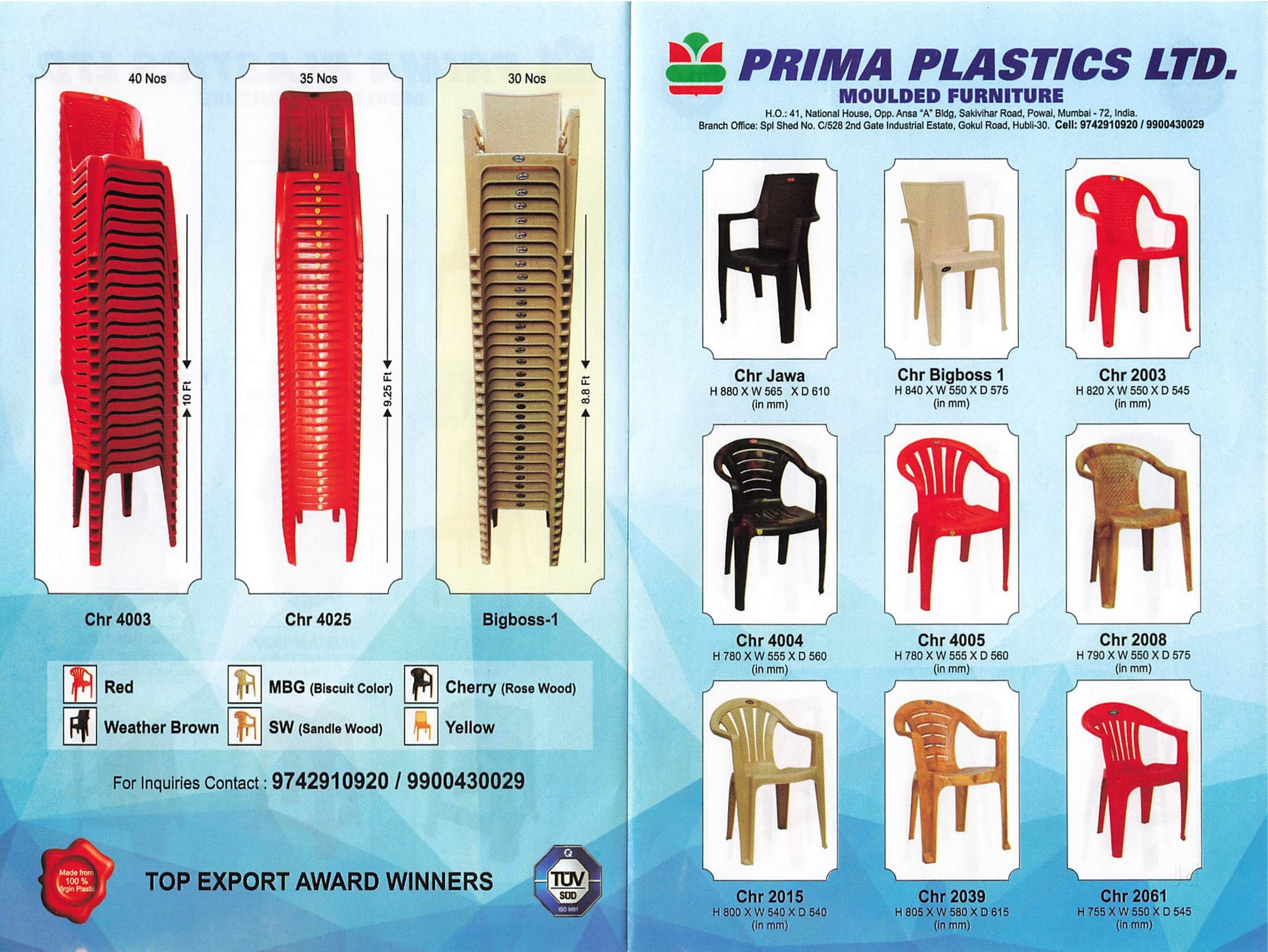 Furniture: Plastic chairs, tables, stools, storage. (Yes, those wedding chairs with white covers? Likely Prima-made.)