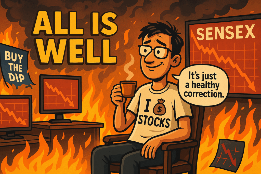 Denial is basically optimism on autopilot – an echo of euphoria’s sentiment, but now in the face of contrary evidence. Key hallmark: People cling to “fundamentals” and “long-term” rhetoric to justify not acting. Ironically, this is when those who ignored fundamentals at the top suddenly become fundamental investors overnight: “The stocks I hold are quality companies; they’ll be fine. This dip is a chance to add more.” There’s actually some logic: if you truly bought great companies, a dip is fine. But in denial, even those holding junk will tell themselves stories. It’s like in Bollywood when the heroine catches the hero flirting and he says, “It’s not what it looks like!” – we create narratives to avoid pain.