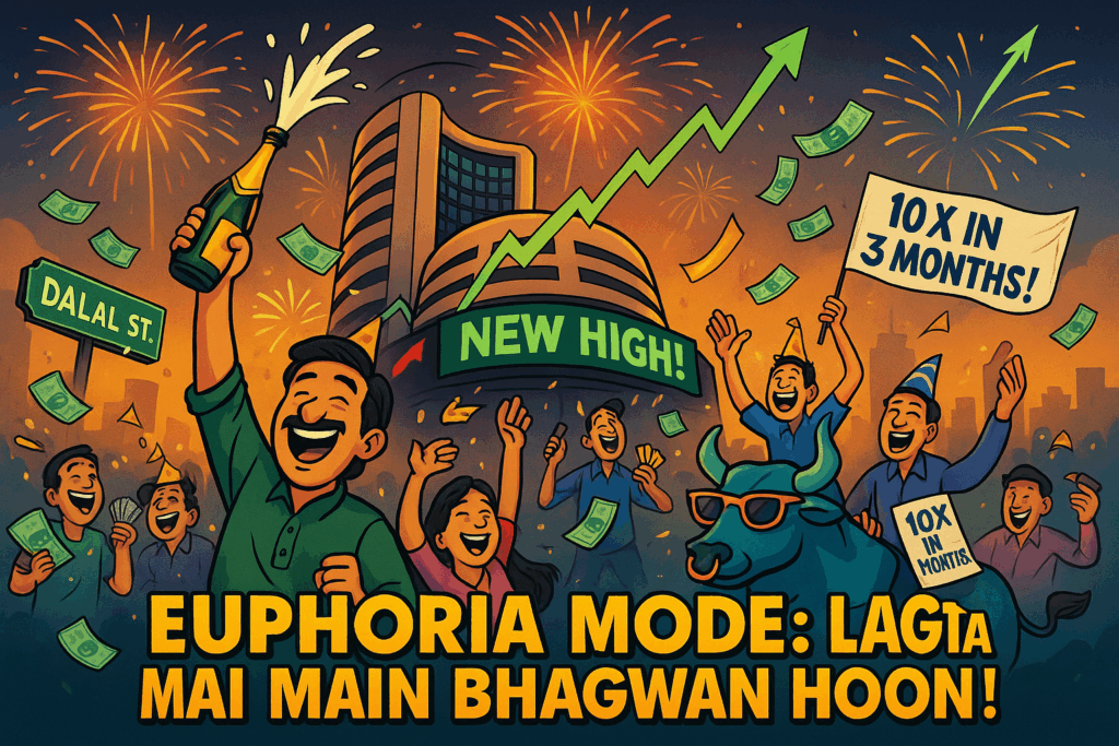 Scene 1: Euphoria – “Lagaan of Luxury” Welcome to the bull market ki baarat – the roaring party where stocks are the groom, investors are dancing relatives, and everyone’s high on optimism (and maybe a little something in their lassi). Euphoria is that peak phase where prices are at all-time highs, everyone believes they’re a genius, and greed is in full flow. Picture the energy of an Indian wedding Sangeet night: Uncle ji, who once thought “stock market is gambling,” is now boasting about his multi-bagger stocks; Aunties are trading tips on WhatsApp instead of recipes; your college roommate who couldn’t tell an income statement from a grocery bill is now a crypto guru on Twitter. Sentiment is through the roof. This is the “sab moh maya hai… but let’s get rich first” phase. Every dip is seen as a buying opportunity – “Buy the dip, bro, market can only go up!” – and any cautionary voice is dismissed as “jealous or jaded.” Fundamentals? Hah! Even junk companies find their stock prices doubling because, in a bull mania, investors start ignoring risk entirely. It’s that classic “this time it’s different” delusion. You feel invincible – like Virat Kohli hitting centuries on flat pitches, you think you can’t go wrong. The media is cheering, analysts are raising target prices, and IPO hai toh bas party hai (every IPO lists at a premium, making day-one buyers quick bucks). Money is so easy it feels like Munna Bhai MBBS – even if you flunked Finance 101, the market gives you full marks.