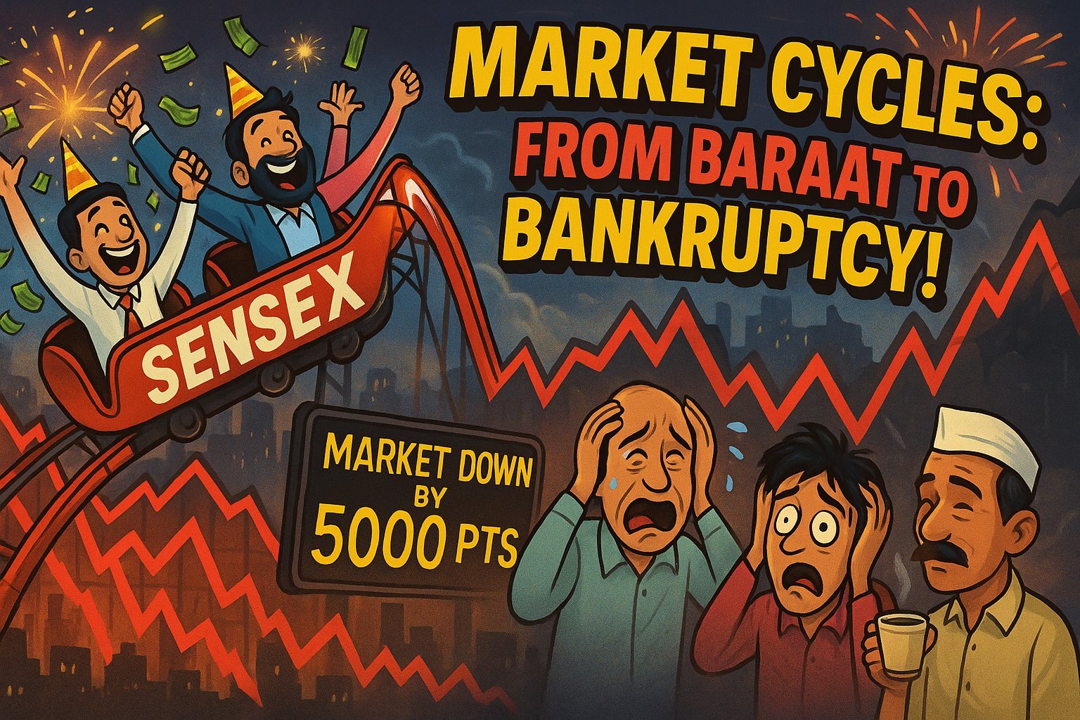 Namaste, fellow FOMO investors! Buckle up, because today we’re taking a wild ride through the market cycle – that ridiculous, repetitive saga of booms and busts that makes us feel like kings one minute and fools the next. Think of it as an Indian masala movie plot: there’s drama, comedy, romance (with your stocks), heartbreak, and eventually a hopeful ending… until the sequel. The stock market, much like a big fat Indian wedding, has phases where everyone’s dancing in joy, followed by times when the food is cold, the DJ has fled, and we’re left holding stale gulab jamuns wondering “What just happened?” In market-speak, these phases have fancy names: euphoria, denial, panic, depression, and recovery. But fear not – we’ll spice them up with Bollywood flair, cricket analogies, and enough sarcasm to make even a stand-up comic in Mumbai proud.